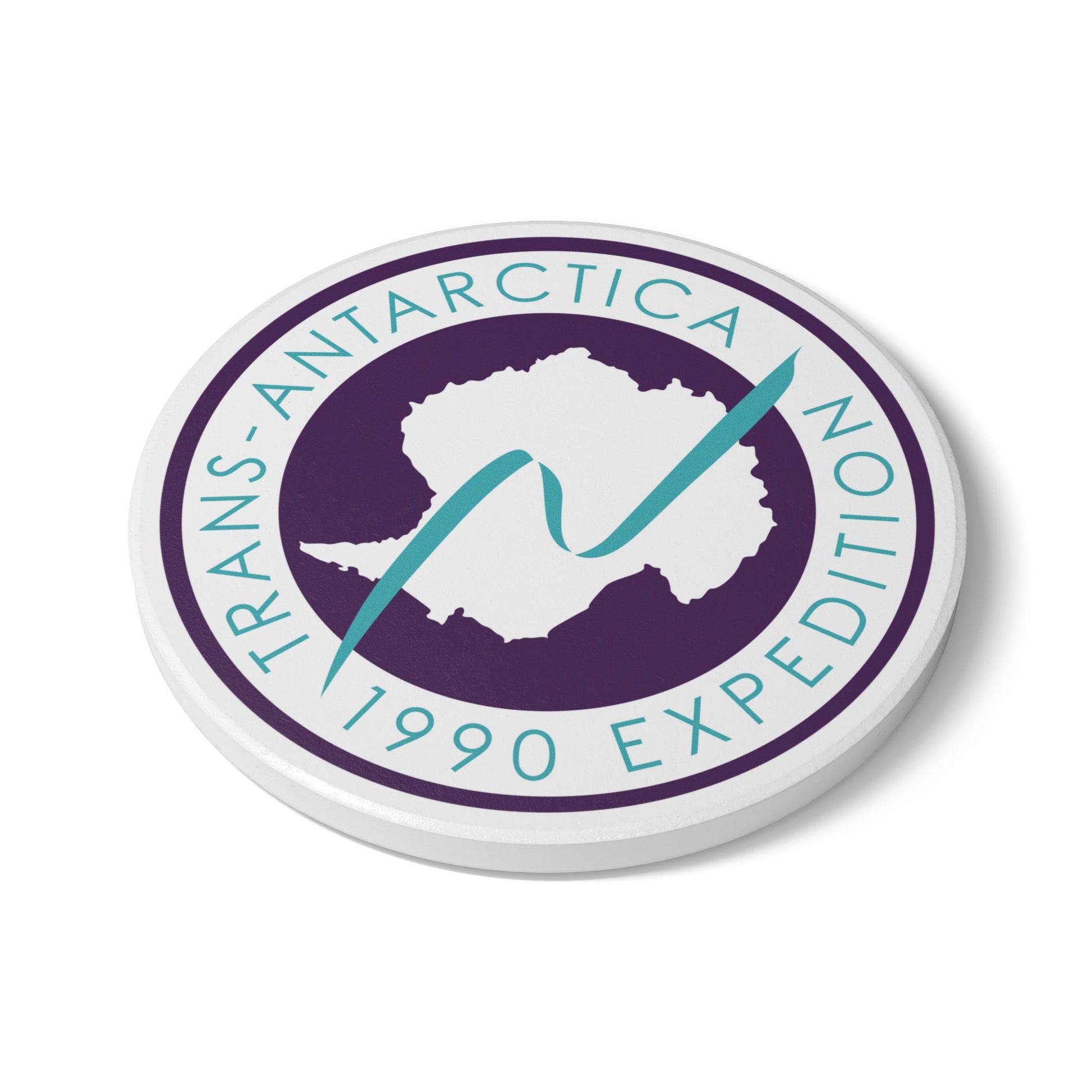 This premium white ceramic coaster features the iconic Trans-Antarctica 1990 Expedition logo. With a non slip cork backing and clean design, its the perfect blend of style and utility. Whether it's coffee, tea, or something stronger, every drink rests on history.